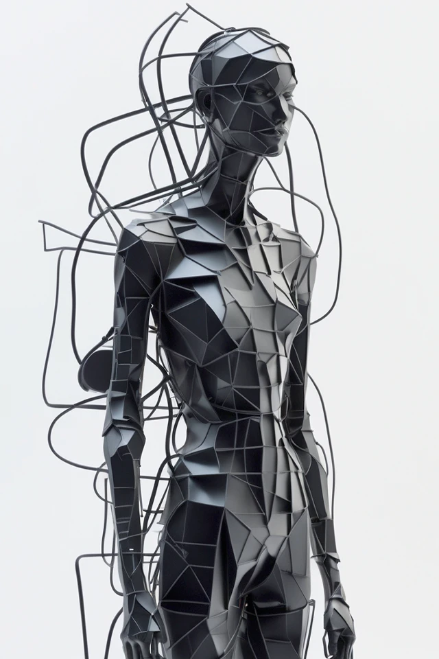 Estas figuras no son retratos; son mapas de intención. Cada obra comenzó como un diálogo entre la inteligencia artificial y mi propia búsqueda estética. A través de algoritmos, busqué capturar esa naturaleza fragmentada que nos define en la modernidad: un conjunto de direcciones opuestas, de grosores variables, de ángulos que se cruzan sin llegar a tocarse del todo.