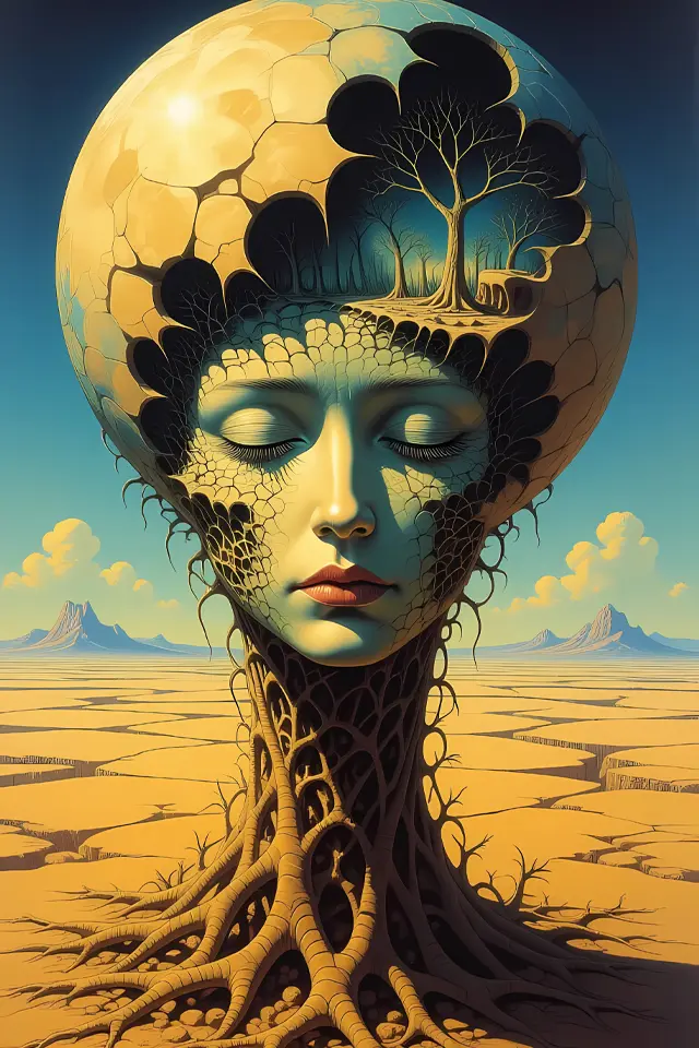 La obra se apoya en el surrealismo psicodélico al usar “colores vívidos” para describir un vacío, lo que genera una tensión visual palpable. La mente no es una hoja en blanco, sino un paisaje devastado lleno de vestigios. La frase sobre el “detalle meticuloso” refleja mi propio background en la dirección de arte, aplicando esa disciplina de precisión a la expresión de un estado emocional profundo, creando una representación visual que es tan rica en textura como en significado.