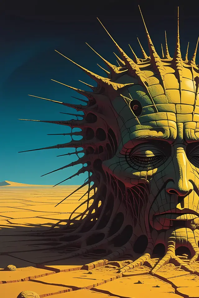 Profundidad y Tensión: Reforcé la sensación de una “expansión estéril” creando una profundidad en la composición que sugiere un espacio vasto e infinito dentro de la mente. La iluminación fue ajustada para ser tenue, pero precisa, destacando las estructuras desoladas y dándoles una presencia inquietante.