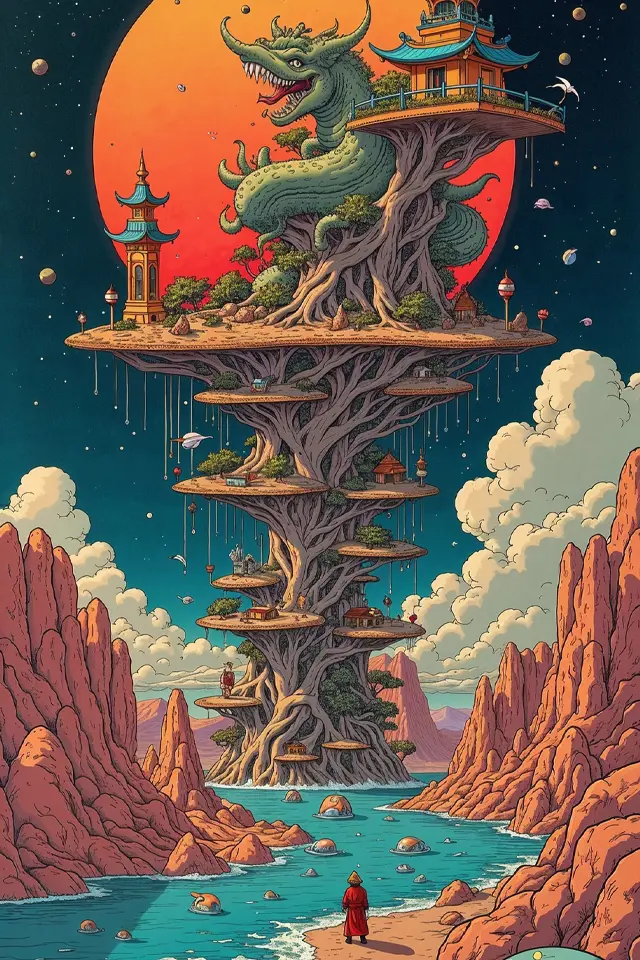 - Composición y Narrativa Visual: Me aseguré de que la composición, aunque rica en detalles, guiara el ojo del espectador de manera fluida, como en una página de cómic, invitando a la exploración de un “mundo donde la imaginación no tiene límites”, un principio fundamental en la obra de Giraud.