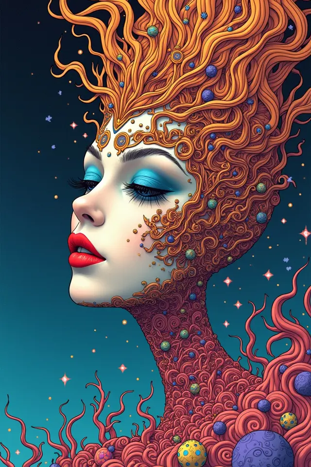 En esta pieza, busco capturar esa “sinfonía de intrincación” que caracteriza su linework, pero filtrada a través de mi propia voz artística. Aunque el prompt habla de una “ilustración dibujada a mano”, mi desafío fue traducir esa sensibilidad artesanal a las herramientas digitales, manteniendo la fluidez y la gracia de la línea pero con mi paleta de colores vibrantes y mi enfoque en la composición digital. El “reino fantástico” que describe el prompt es el mismo territorio donde mi surrealismo y psicodelia a menudo se encuentran, creando un diálogo entre su legado y mi visión contemporánea.