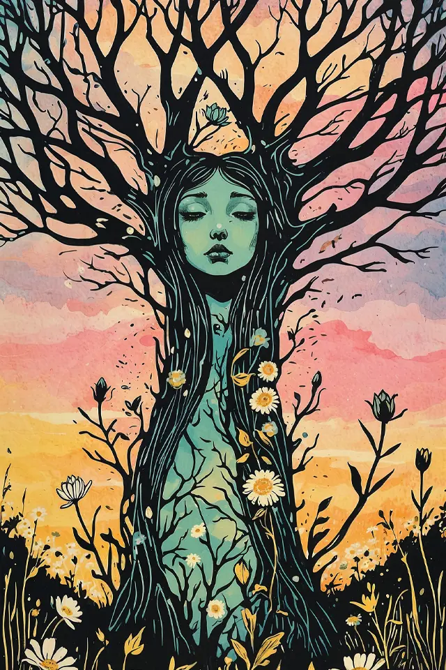 La figura de La Arquitecta del Florecer es una metáfora de la capacidad creativa femenina y su rol como guardiana del potencial. El jardín suspendido, ahora en colores de arcilla y sombra, ya no es solo un sueño, sino un territorio forjado por la voluntad.