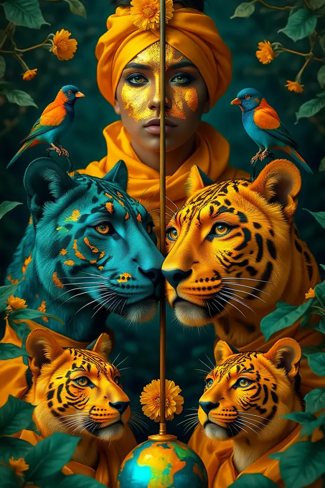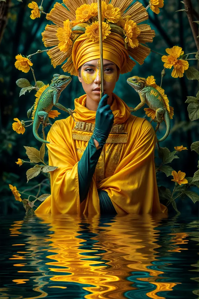 La Fauna Latente que rodea a la Reina (lagartos, y por extensión, los camaleones, jaguares y aves de la serie) actúa como su séquito místico. El jaguar representa el poder terrenal y la conexión con el inframundo, las aves simbolizan la conexión con el cielo y lo divino, y los lagartos y camaleones (presentes en otras piezas de la serie) simbolizan la adaptación y la alquimia. Esta fusión de la moda ceremonial con la vida silvestre colombiana crea una alquimia visual que transforma el retrato en algo profundamente cultural y simbólico.